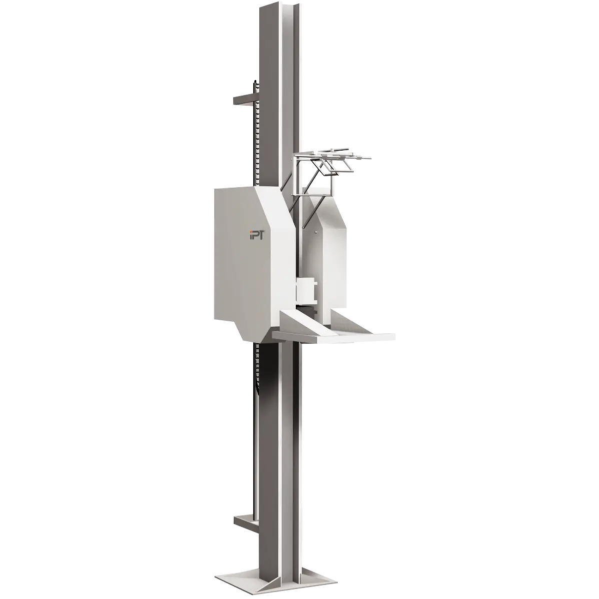 Ces dispositifs sont en principe très similaires et se distinguent principalement par leur charge maximale (poids des échantillons). Ils sont équipés d’une colonne sur laquelle un chariot élévateur avec une plateforme se déplace verticalement. La commande se trouve dans un tableau de commande installé en dehors de la zone de danger.