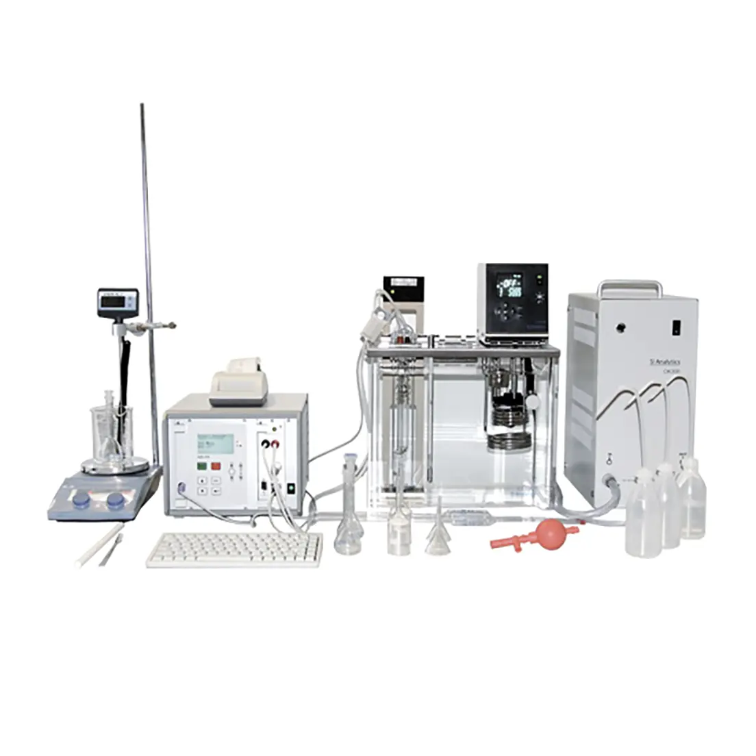 Das komplette Labor-Set für die K-Wert-Bestimmung umfasst ein Ubbelohde-Viskosimeter mit Messstativ, das Viskositätsmessgerät mit Drucker, den Badthermostat mit Durchflusskühler und diverse Glaswaren.